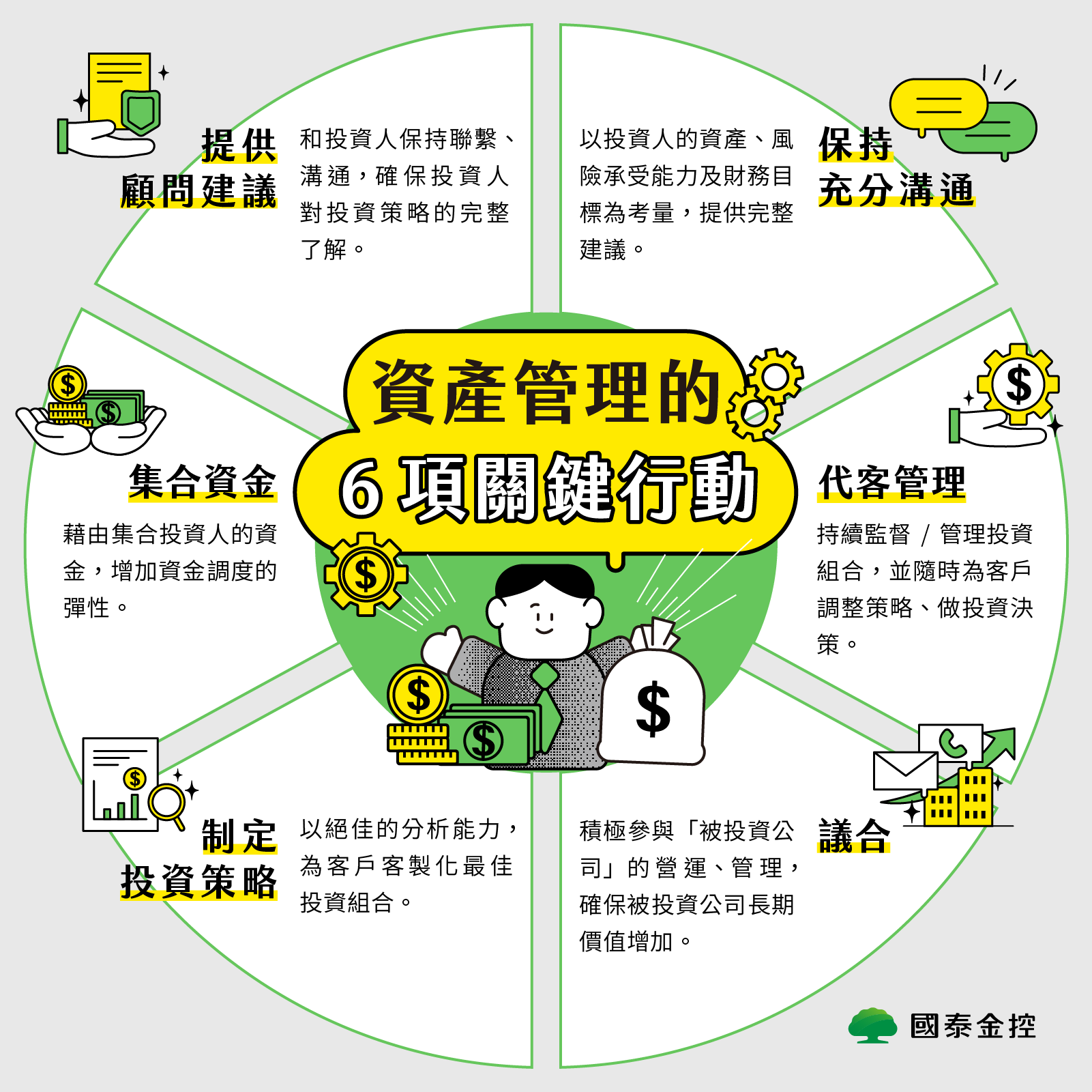 資產管理者會根據與投資人間的約定,為其篩選適合的投資商品組合、擬定投資策略,幫助投資人在可承受的風險下,最大化的靠近財務目標,並在過程中,持續觀察市場變動、快速調整投資產品組合。
