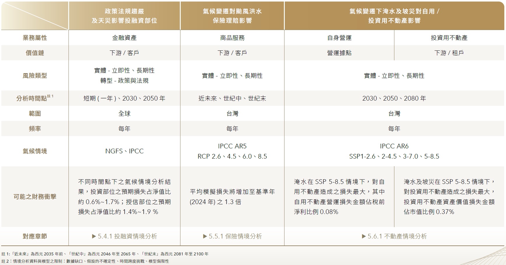 為深入理解氣候變遷所帶來的財務影響,國泰金控針對主要核心業務及價值鏈進行了多種情境下的財務量化分析研究,旨在進一步驗證策略的韌性並制定相應的因應措施。目前,國泰金控所使用的國際通用氣候情境,涵蓋「聯合國政府間氣候變遷專門委員會(IPCC)」、「國際能源署 (IEA)」及「中央銀行與監理機關綠色金融系統網絡 (NGFS)」的資料,並將各國的「國家自主貢獻」(NDCs) 納入評估範圍,全面掌握氣候風險對金融體系的潛在影響。