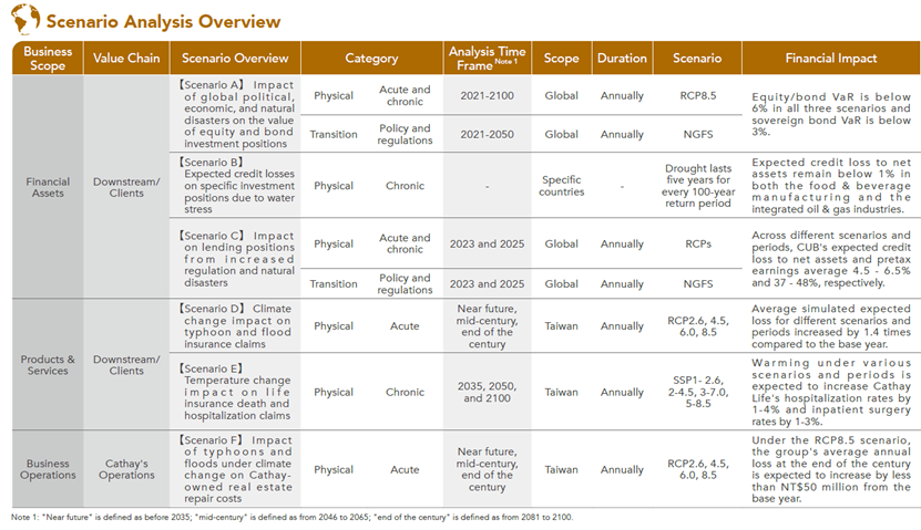 To better understand the financial impacts of climate change, Cathay FHC has conducted quantitative financial scenario analyses across its core businesses and value chain. These analyses aim to validate the resilience of its strategies and formulate appropriate mitigating actions. Currently, Cathay FHC adopts internationally recognized climate scenarios, including those from the