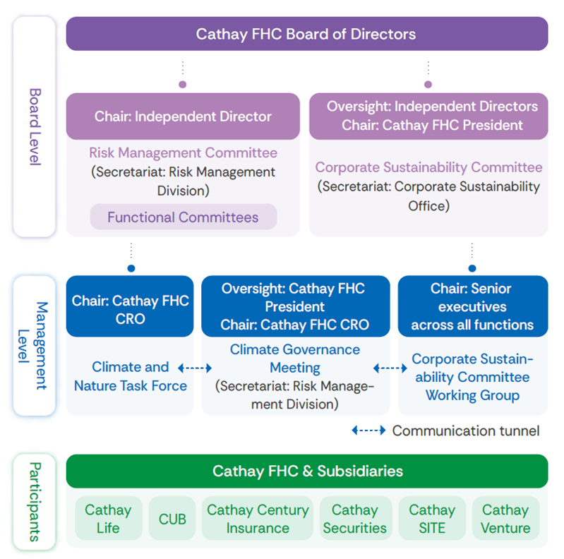 To strengthen board effectiveness and ensure sound sustainability governance, Cathay has established two board-level functional committees the Corporate Sustainable Development Committee and the Risk Management Committee tasked with reviewing and supervising the implementation and management of ESG and climate-related policies, systems, strategies, and plans. In addition, quarterly Climate Governance Meetings are convened for senior executives to discuss and build consensus on key climate and nature-related issues, thereby enhancing our responsiveness and resilience.