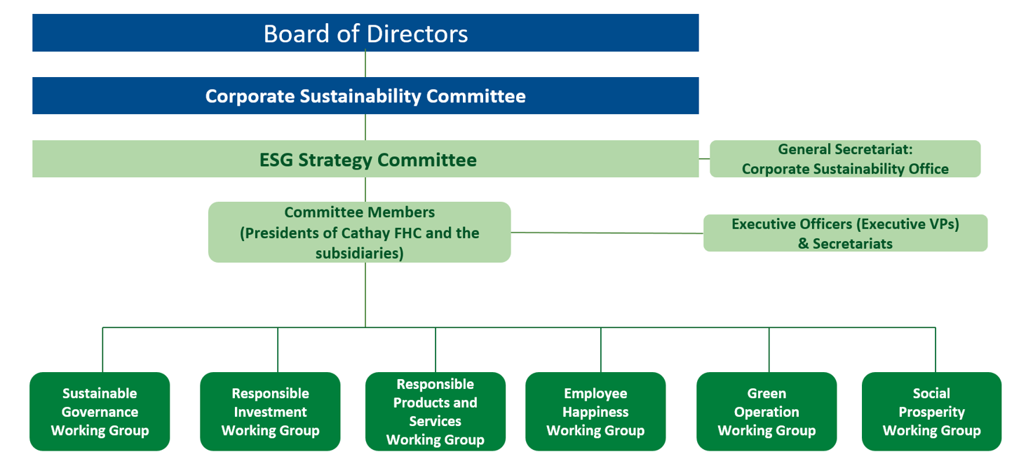 To strengthen the Group's ESG governance framework, Cathay FHC established the position of Chief Sustainability Officer (CSO) in August 2025. The role is concurrently assumed by Mr. Chang-Ken Lee, President of Cathay FHC, who also serves as a member of the Corporate Sustainability Committee and Chair of the ESG Strategy Committee. The CSO is responsible for formulating the Group's sustainability strategy and goals, and overseeing the implementation of sustainability initiatives.