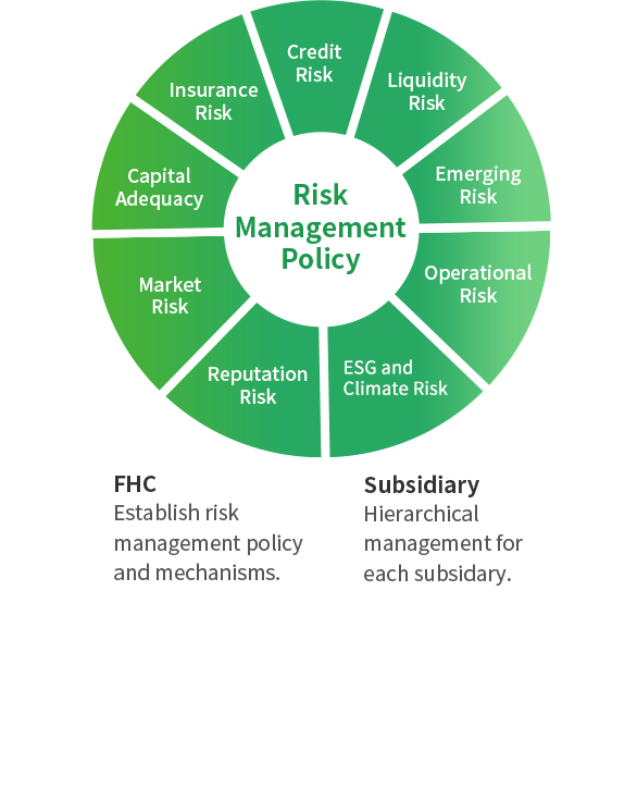 The FHC has set up an independent Risk Management Division to implement governance and ensure measured risk-taking. The division is responsible for establishing the related policies and guidelines and also for executing risk management practices throughout the Group.