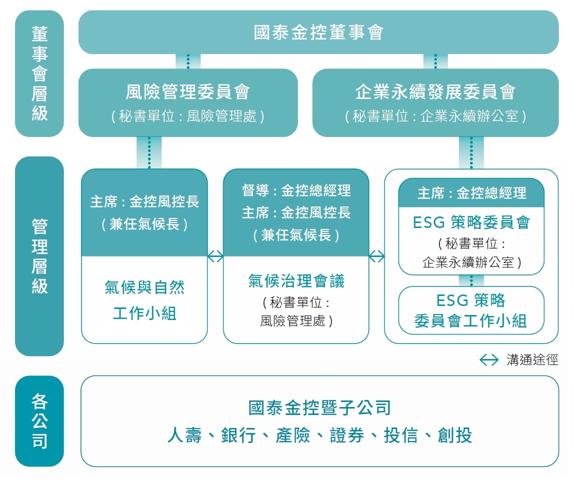 有效的氣候治理架構對於公司調控氣候風險與掌握機會,以及履行對利害關係人的責任是至關重要的。國泰透過董事會決策、監督及管理氣候相關議題,設置氣候長負責統籌與聯繫集團氣候相關議題,並作為集團氣候相關策略之諮詢角色。