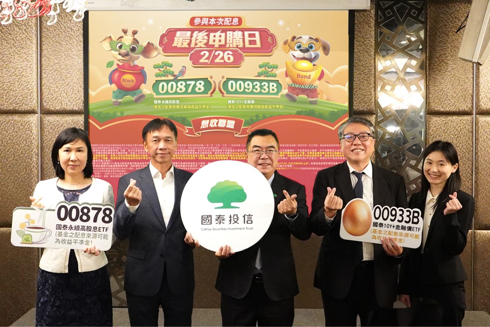 註:(1)國泰永續高股息ETF為國泰台灣ESG永續高股息ETF基金(基金之配息來源可能為收益平準金)之證券簡稱(證券代碼:00878),有關00878之ESG 資訊,投資人應於申購前詳閱基金公開說明書或投資人須知所載之基金所有特色或目標等資訊,或至國泰投信官方網站查詢(https://cathaysite.tw/J3DobPN )。(2)內容涉及個股或產業或投資標的,僅為參考舉例,不代表產業或投資標的推薦,且不代表本公司基金未來投組之必要持股或投資標的,投資人須衡量自身之投資風險。未來仍可能隨市場之變化彈性調整投資策略。投資人申購本公司基金係持有基金受益憑證,而非本文提及之投資資產或標的。(3)國泰10Y+金融債(基金之配息來源可能為收益平準金)為國泰10年以上投資級金融債券ETF基金(基金之配息來源可能為收益平準金)之證券簡稱(證券代碼:00933B)(4)國泰10年以上投資級金融債券ETF基金(基金之配息來源可能為收益平準金)可分配收益之分配,應於本基金成立日起屆滿120日(含)後,經經理公司作成收益分配決定後,於每月結束後之第45個營業日前(含)進行分配;收益分配之停止變更受益人名簿記載期間及收益分配基準日由經理公司於期前公告。