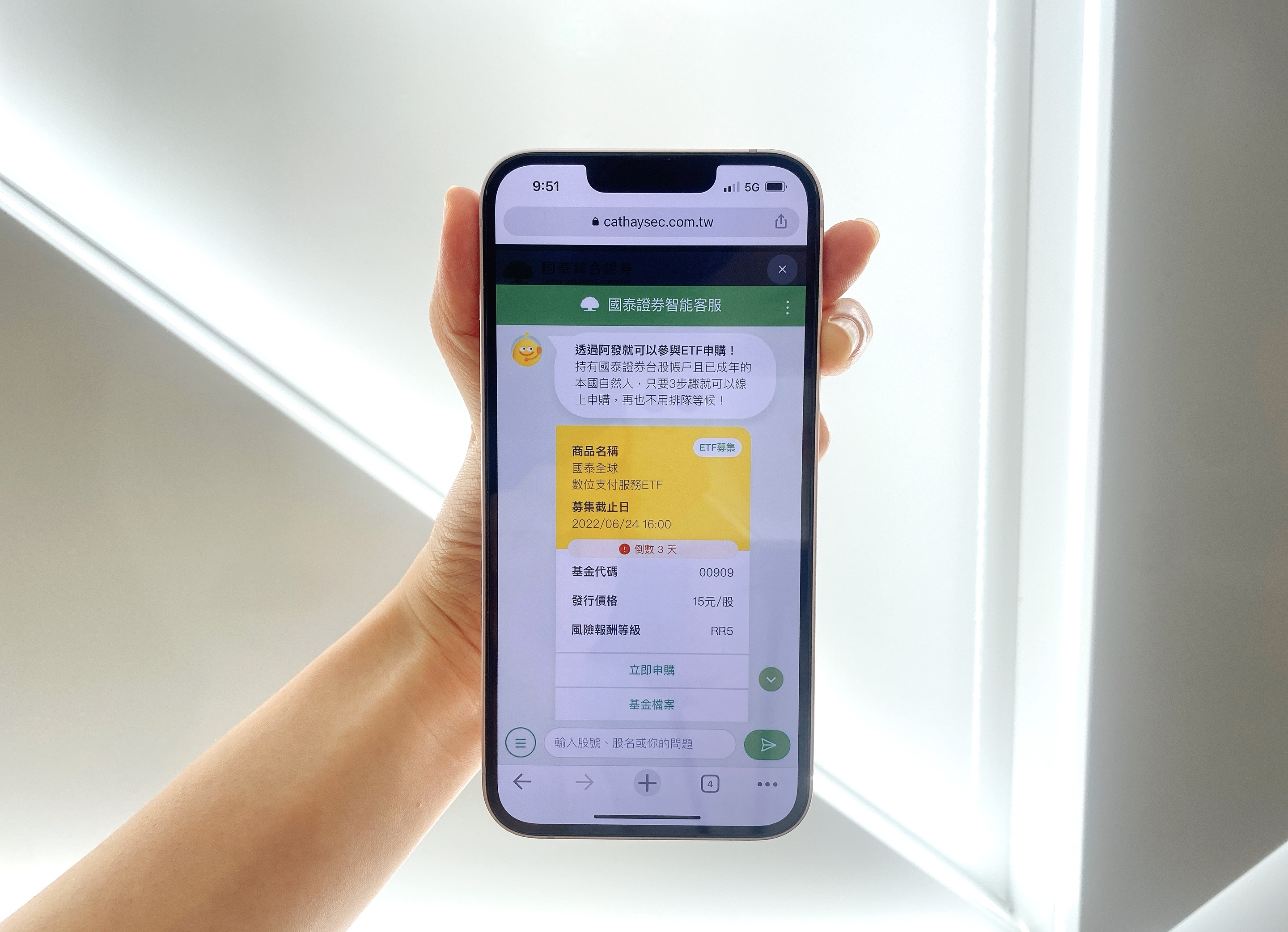 國泰金控再次展現超前的金融科技實力,即日起智能客服「阿發」推出全新服務,客戶可直接透過國泰證券智能客服「阿發」線上申購ETF IPO,首檔結合國泰投信推出「國泰全球數位支付服務ETF(股票代號:00909)」IPO線上申購。只要擁有國泰證券帳戶即可在募集期間內24小時線上辦理,不用到現場排隊,免除紙本申購流程,6月24日前快找阿發輕鬆跟上數位經濟的百兆錢潮。