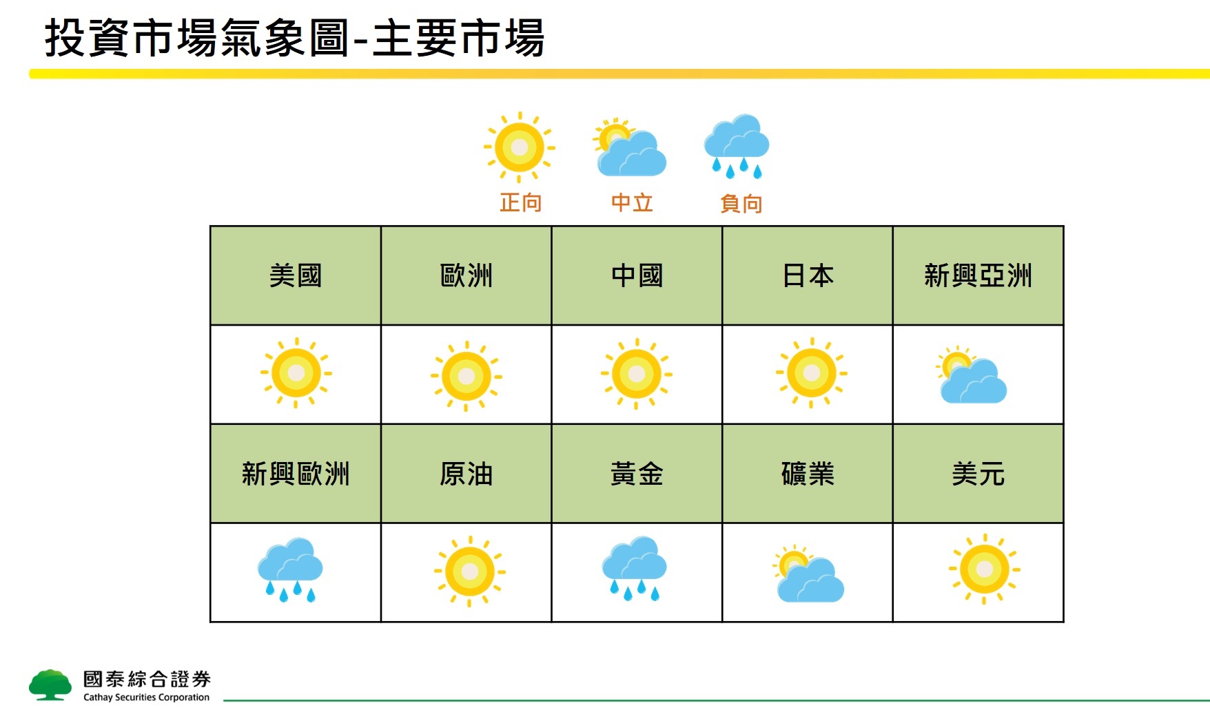 國泰證券進行2022年6月全球主要股市及商品觀察,因疫情逐漸趨緩,歐美等成熟國家市場需求回升、日本市場於後疫情期間外資大量匯入、中國解封後復工預期下半年景氣將好轉,以及美元貨幣持續走強等,故對歐美、中日市場及美元抱持「正向」看法,而新興亞洲因受美元升值導致資金外流,則持較「中立」看法;反之,位於僵持不下的烏俄戰爭熱區的新興歐洲以「保守」看法看待。
