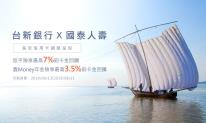 因應旅遊旺季,特別開放3,000名限量名額,刷台新銀行指定卡別如:太陽卡、玫瑰卡、FlyGo卡、@GoGo卡,只要網路投保國泰人壽e悠遊旅行平安保險,單筆保費滿800元,就可享最高7%刷卡金回饋(含原卡片權益)。