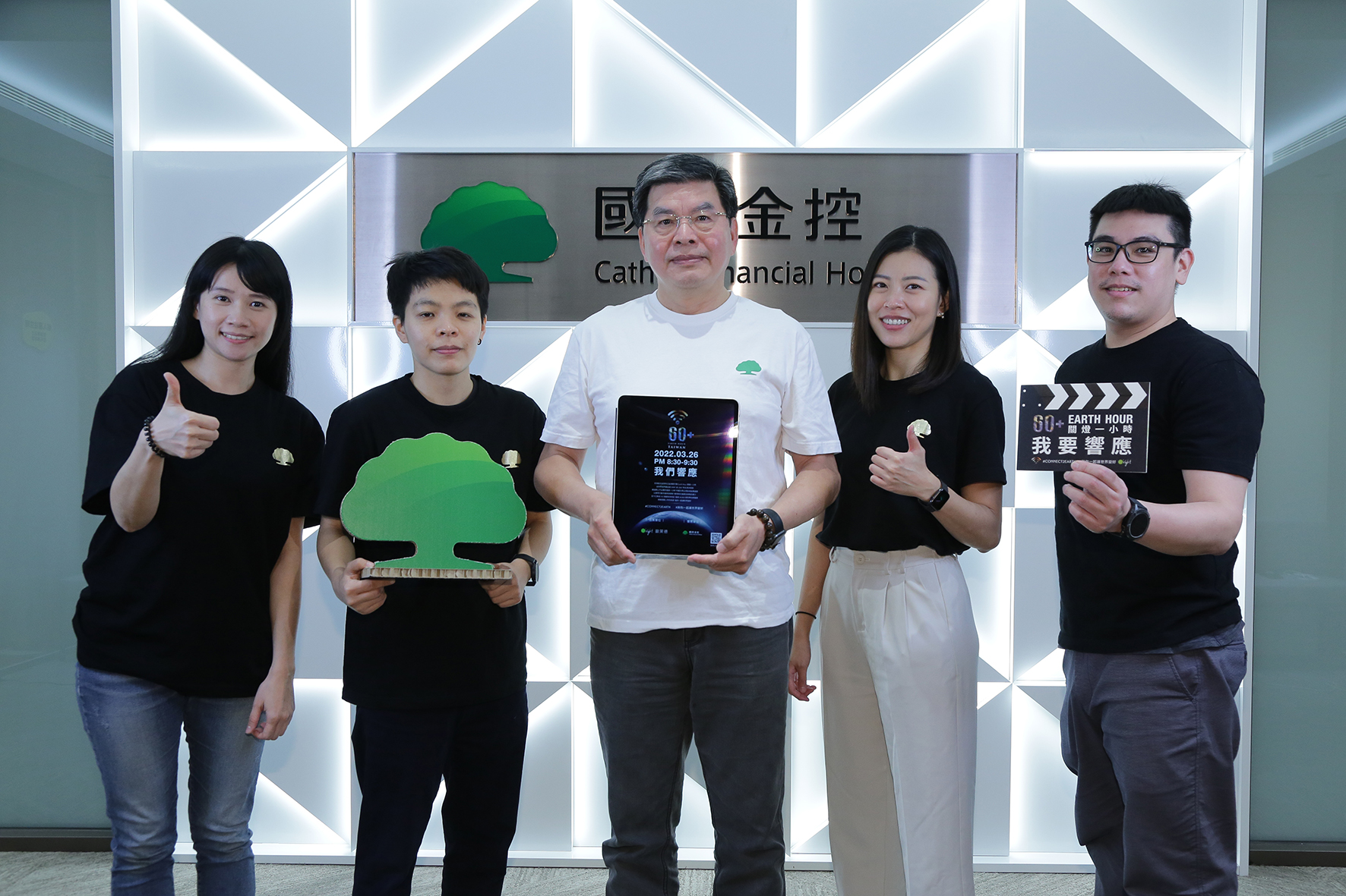 國泰金控自2016年起每年響應「Earth Hour 關燈一小時」活動,每年位於信義商圈三棟大樓,包括國泰金融中心、國泰置地廣場及信義經貿大樓從不缺席,今年更擴大加入國泰人壽全台大樓。其中,位於台北市仁愛路上高27層樓的總部大樓,擁有磚紅色的醒目外觀,大樓頂部猶如船首的側邊有偌大的綠色大樹標誌,數十年來不僅是仁愛路上的知名地標,亦是國泰創立60年的企業重要識別, 此次也加入關燈節電行列,一起響應減碳決心。