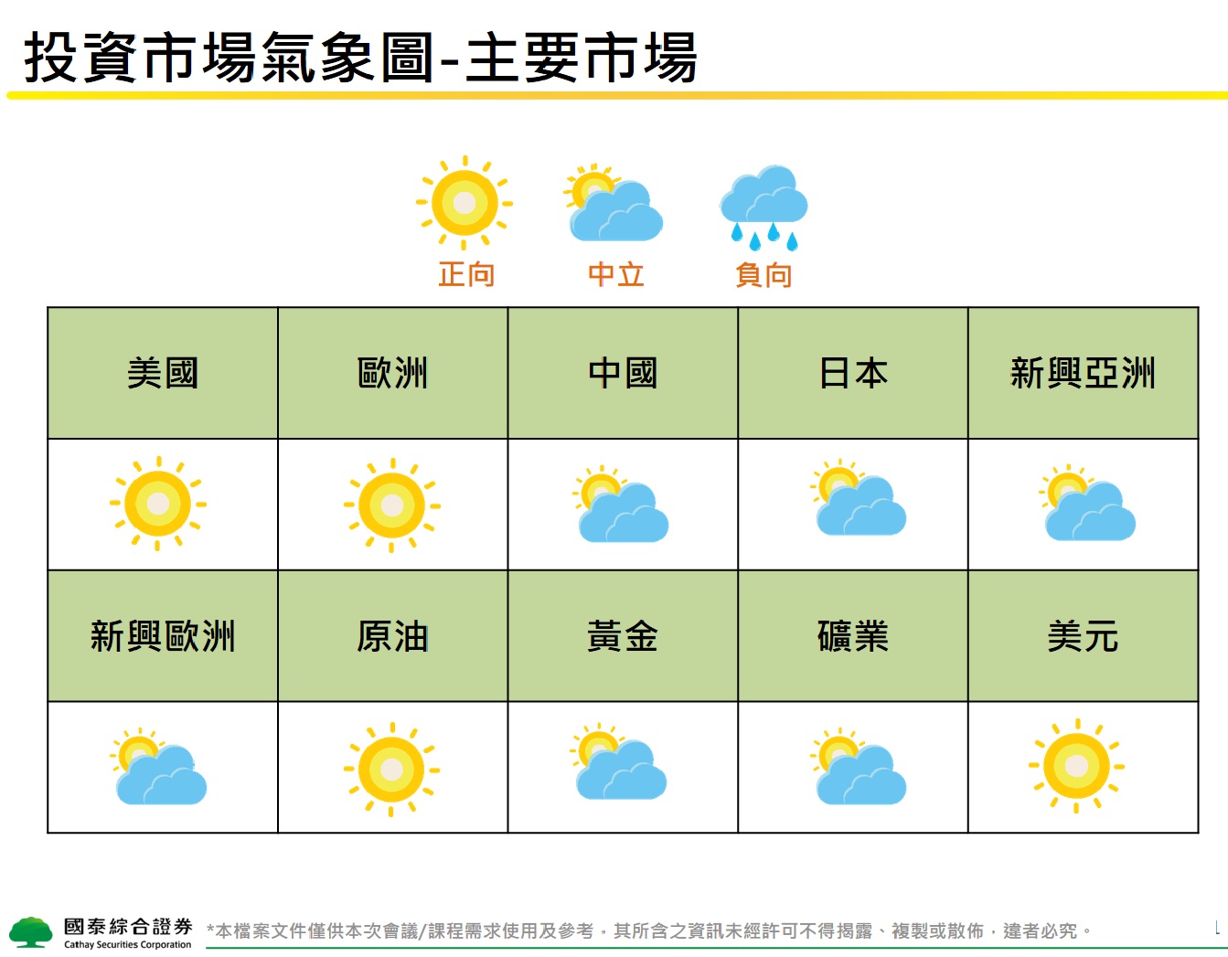 2021年尾聲全球經濟回溫,國泰證券觀察全球主要股市及商品,發布11月投資氣象觀點,對於歐美市場抱持「正向」看法,國泰證券認為,全球進入後疫情時代,在各國央行持續進行貨幣寬鬆政策下,經濟大幅復甦,導致原油價格飆漲,通膨預期持續升高。而在此通膨環境下,全球「能源危機」議題也隨之浮上檯面,國際間轉趨重視ESG綠能永續發展布局,建議投資人可多加關注「綠能」相關產業概念股,以及在ESG表現優良的相關個股,在市場震盪時預期會有較佳的表現。