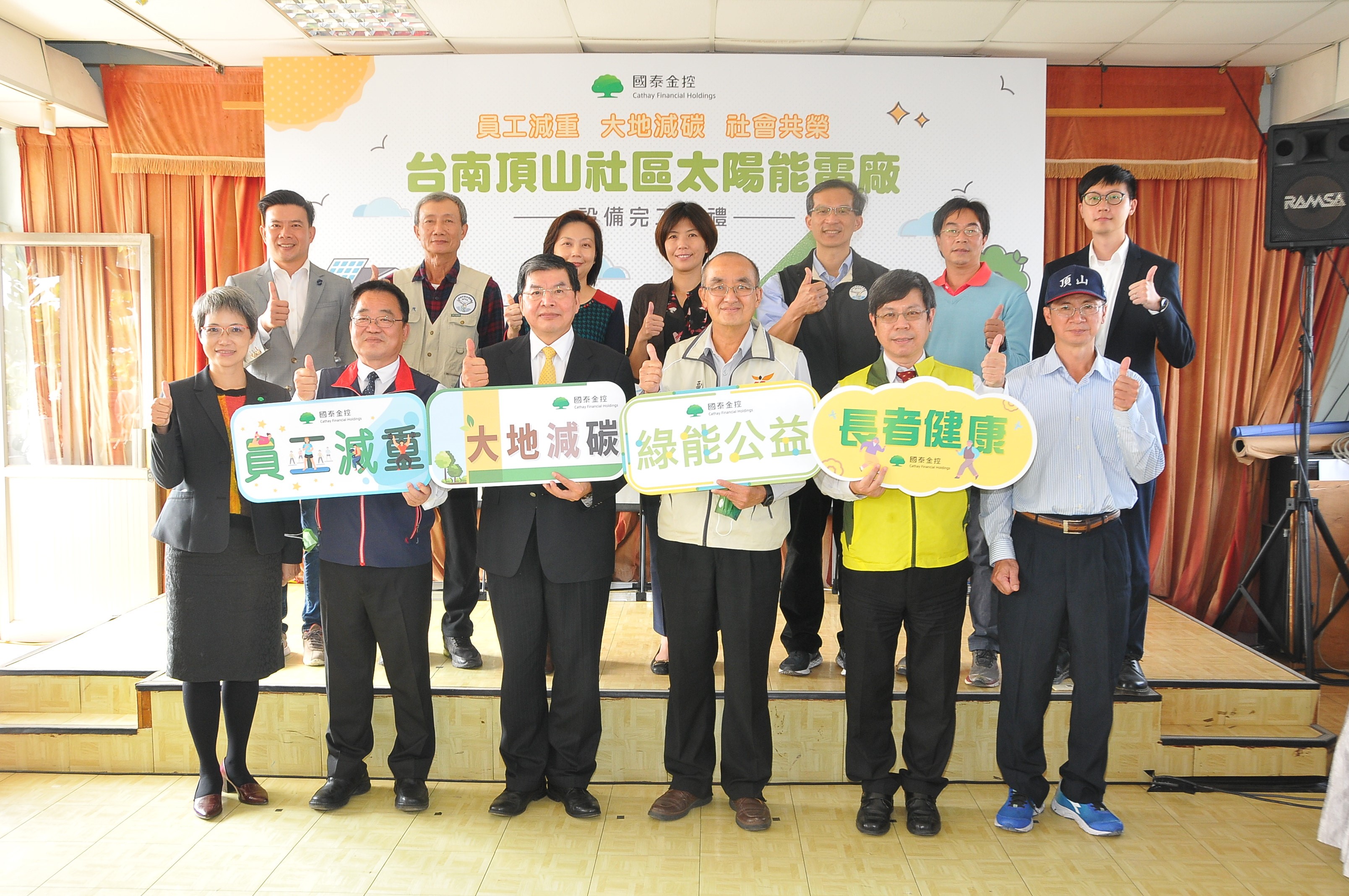 國泰金控自2016年起開始以「員工減重、大地減碳、社會共榮」為宗旨,攜手多元策略夥伴發展綠能公益,2018年完成第一案位於屏東「陽光永久屋」的建置,而第二案座落於台南七股頂山社區「後港國小頂山分校」的太陽能電廠亦將於今年12月底設備完工,其綠電由國泰人壽購回自用,創造最大的環境效益,而購電費用也將回饋至頂山社區的銀髮族,此種綠能公益模式是少見的創舉。