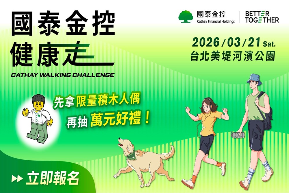 國泰金控長期關注全民健康議題,秉持「BETTER TOGETHER共創更好」品牌精神,從集團層面推動「健康促進」策略。繼2025年5月首度舉辦「國泰金控健康走」,成功吸引逾5,000人次熱烈參與後,國泰金控將擴大活動規模,於2026年3月21日於台北美堤河濱公園舉辦「2026國泰金控健康走」,並由台北市體育局協辦,號召萬人一起走出健康未來!即日起至2026年1月7日開放報名,凡完成報名繳費者,即可參加抽獎活動,不僅有機會獲得萬元Apple好禮、500點小樹點(生活)等,前3,000名報名者還可獲得限量「國泰健康走紀念積木人偶」,兼具趣味及收藏價值,為參與活動留下專屬紀念。活動自開放報名以來迴響熱烈,短短一週即突破千人報名,展現全民對健康活動的高度關注與支持。