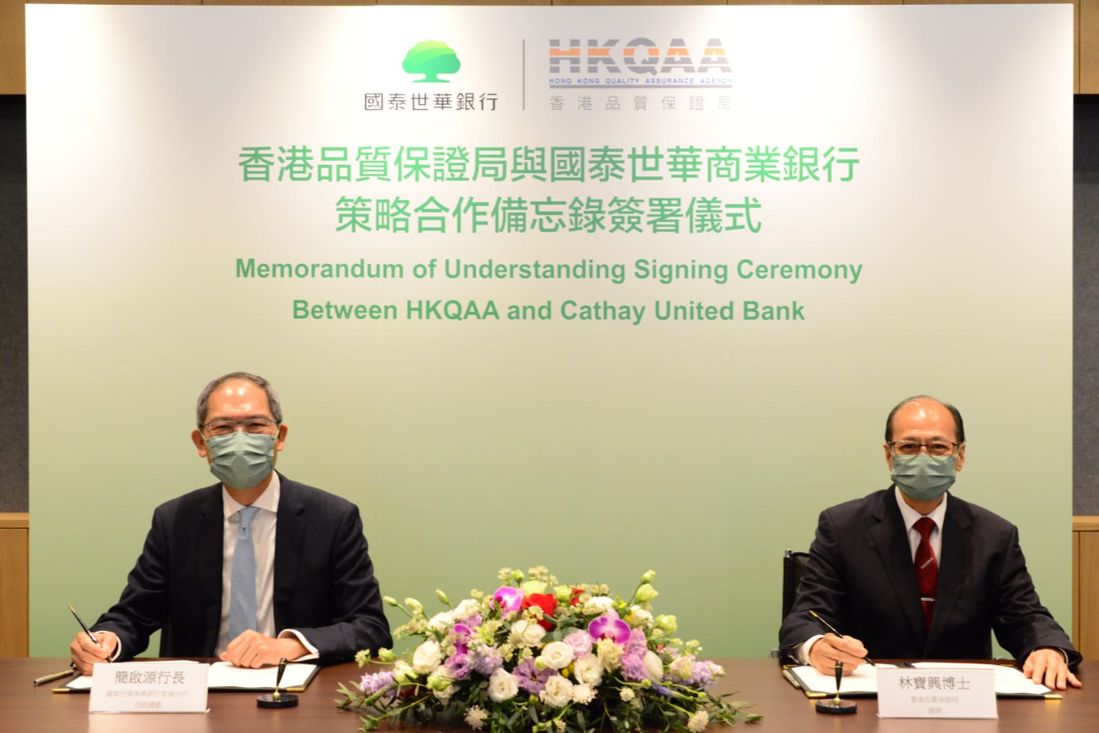 國泰世華銀行香港分行6月15日宣佈與香港品質保證局(Hong Kong Quality Assurance Agency, HKQAA)簽署合作備忘錄(MOU),深化雙方在綠色金融業務上的推廣及合作範疇,協助銀行客戶打造合適的ESG融資方案,推動香港分行ESG融資業務。