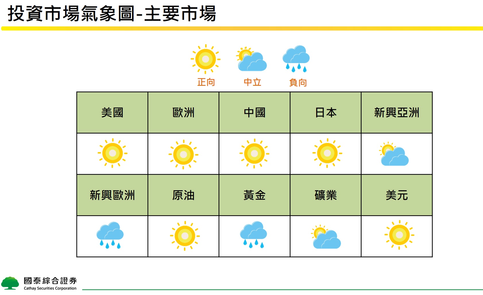 國泰證券針對2022年7月全球主要股市及商品觀察,各國市場變化多端,其中,因疫情逐漸趨緩、夏日消費旺季將至,使得歐、美等成熟國家市場需求回升、日本市場於後疫情期間外資大量匯入、中國解封後復工,以及美元貨幣持續走強等,故對歐美、中日市場及美元抱持「正向」看法,而新興亞洲因受美元升值導致資金外流,則持較「中立」看法;反之,位於仍僵持不下的俄烏戰爭熱區之新興歐洲則持「保守」看待。國泰證券觀察,全球金融市場短期股市雖動盪不已,但仍有突破困境的契機,在震盪期間,全球「成熟市場」可做為資產配置的核心,尤以美、歐、日製造業PMI指數(採購經理人指數)相對全球製造業PMI強勢,建議投資人可觀察其產業,預期會有較佳的表現。另外,下半年因美元走強,全球市場除了可關注美股外,中國股市因其政府政策與解封後經濟活動的推動,以及東協國家中「印尼」、「越南」市場也隨著經濟基本面及企業獲利好轉,使得資金流入,投資人不妨可多加評估。