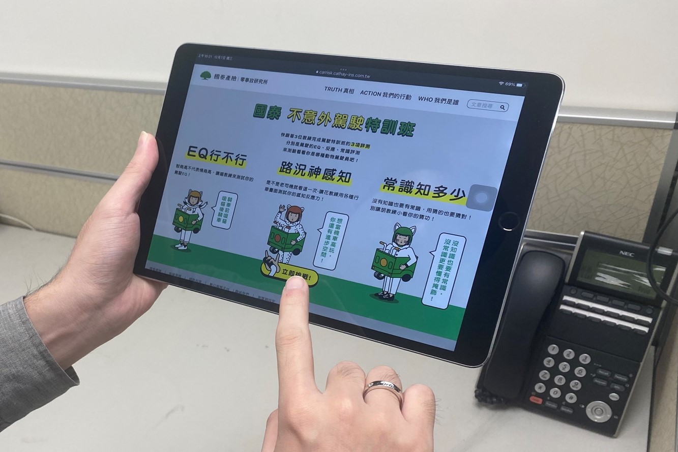 道安資訊平台資料指出,2022年1-11月的道路交通事故統計,事故受傷總人數達44萬9647人,其中年輕機車駕駛(18-24歲)受傷人數就佔了9萬4404人,代表車禍事故每5人就有1人是年輕新手駕駛,為此國泰產險特別在「零事故研究所」網站推出「不意外駕駛特訓班」專區,透過駕駛能力綜合評測,讓新手駕駛具備危險感知、安全駕駛意識。為吸引年輕族群上線參與模擬駕訓班,評測方式模擬電玩操作並依據駕駛行為分數由低而高,依序歸類為鬥牛(橫衝直撞)、貓頭鷹(馬路三寶潛力股)、野馬(駕輕就熟)、兔子(標準的老司機)動物駕駛角色,幫助瞭解自身駕駛行為與習慣,藉此提升交通安全風險意識。