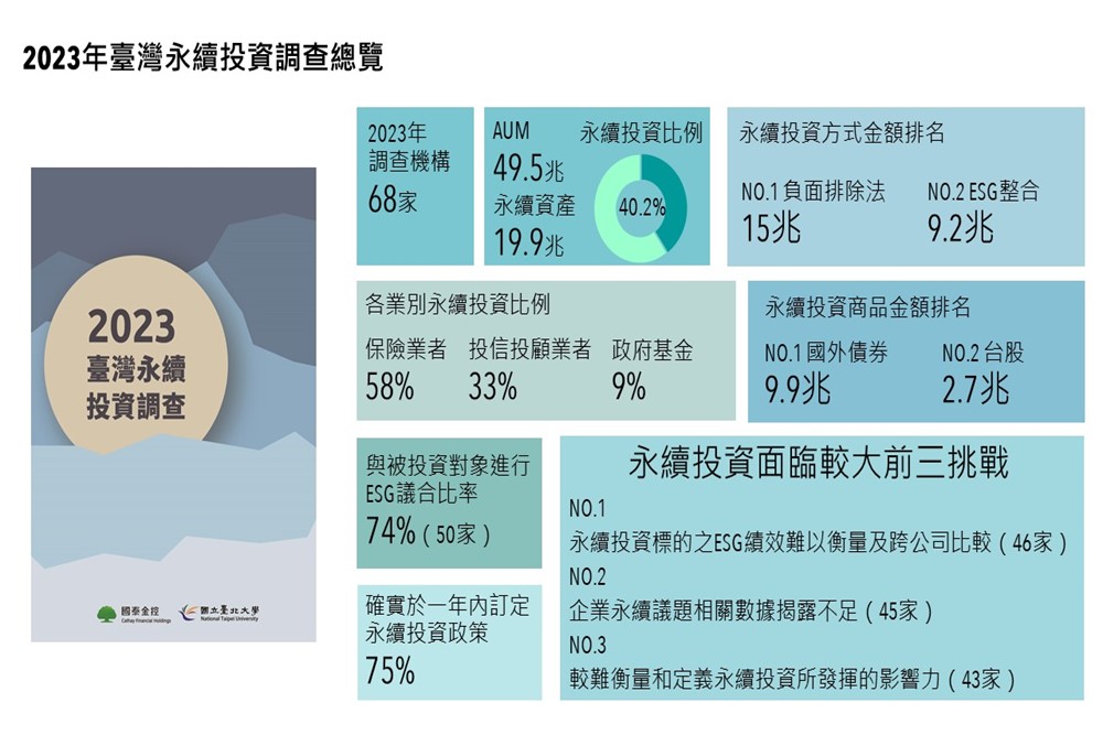 本調查由國泰金控贊助委託國立臺北大學全球變遷與永續科學研究團隊,根據全球永續投資聯盟(Global Sustainable Investment Alliance, GSIA)的研究方法進行問卷設計,在金管會、臺灣證券交易所及人壽保險、產物保險、投信投顧等三大同業公會、政府四大基金協助下,針對臺灣近百家主要機構投資人進行調查,共回收68份問卷,整體回覆率約65%。