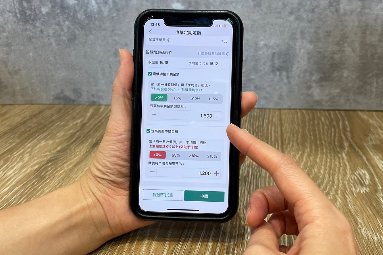 年終獎金陸續入袋,如何有效運用獎金布局新年理財,將是年度投資重要大事,國泰證券透過調查發現,客戶普遍對於「彈性調整扣款金額」有高度需求,為讓投資人更靈活布局,迎接前景難測的2023年,國泰證券自即日起推出業界首創的全新功能「台股定期定額智慧加減碼」。以股價的季均價做為智慧加減碼條件基準點,投資人只需要在國泰證券App定期投資專區進行事前設定,當所申購的台股定期定額投資標的下跌或上漲幅度超過季均價時,即可依客戶原先設定好的申購金額調整,讓台股定期定額變得更靈活聰明,有機會放大年終獎金與紅包。