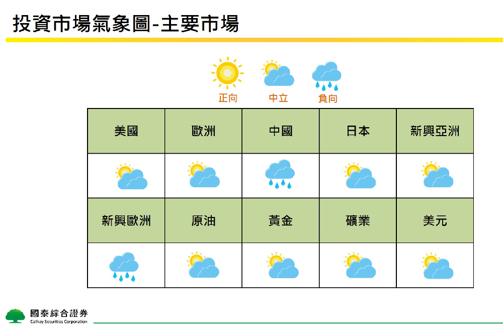 國泰證券觀察全球各類資產,近期市場仍舊處於變動之際,投資建議以「債優於股」的策略來佈局;若以中長期投資來看,在未明顯見到美國總體經濟基本面改善或貨幣政策明顯轉向的過渡時期,建議投資人可關注具防禦性質之產業,如「醫療」、「觀光」與「公用事業」等,以及「ESG」相關類股,預期有較穩健的發展。