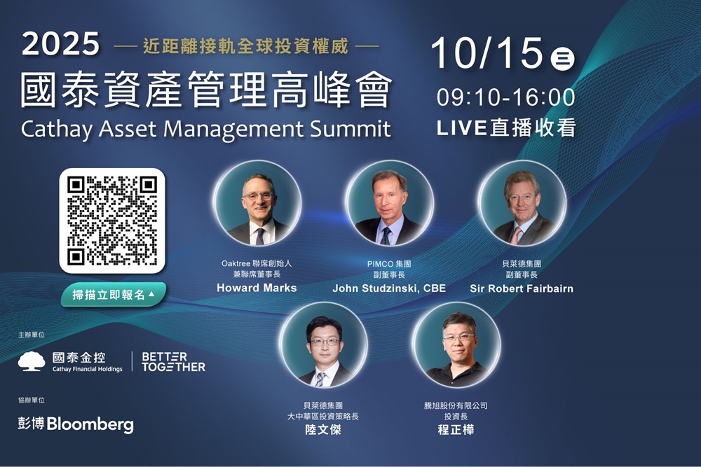 第二屆「國泰資產管理高峰會」不僅已成為國際投資權威對話與交流平台,更是助力台灣投資人在國際政經局勢變動下,掌握市場先機的年度投資盛會。本場峰會將於10月15日(周三)於台北萬豪酒店登場,同步提供線上直播,並於即日起開放報名。詳細議程及國際專家陣容名單詳見網站:https://cathayholdings.info/3VtjdMB(1140912)